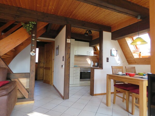 Das Nurdach-Ferienhaus 133, vom Typ Lederstrumpf, verfügt über eine Wohn-/Nutzfläche von ca. 66 m² und kann mit bis zu 4 Personen belegt werden (+ 1 Kleinkind im Kinderreisebett). Im Erdgeschoss befinden sich das Badezimmer (Dusche/WC), der innenliegende Abstellraum, die Küche (Ceran-Kochfeld/Backofen, Kühlschrank/Gefrierfach und Spülmaschine) der Wohnraum mit Essplatz. Zugang zur möblierten Terrasse vom Wohnzimmer. Im Obergeschoss befinden sich ein Schlafraum mit 1 Doppelbett und ein Schlafraum mit 2 Einzelbetten. Nichtraucherhaus - Haustiere erlaubt - Brötchenservice von Ostern bis Oktober!