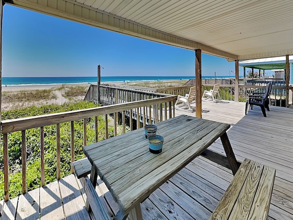 Dieser traditionell gestaltete Strandbungalow, bekannt als Kirk’s Mema’s Beach, bietet einen offenen Wohnbereich mit Sitzgelegenheiten für alle sowie einen Essbereich für Familien. Betrachten Sie den Atlantik vom Ess- und Wohnbereich aus oder gehen Sie auf die überdachte und offene Terrasse des Ozeans, um Ihre Sorgen loszuwerden. Bringen Sie Ihre Familie und Ihren Hundefreund mit, um am Strand herumzutollen, oder nutzen Sie das kostenlose WLAN, um mit denjenigen in Kontakt zu bleiben, die nicht das Glück haben, am Topsail Beach zu sein. Als ob der Strand nicht genug Unterhaltung bietet, kann jeder seine Lieblingssendungen auf einem der 5 Smart-Fernseher mit Kabel und Zugang zu Streaming-Apps im Wohnbereich und in jedem Schlafzimmer ansehen. Hervorragende Aussichten auf den Topsail Sound und die Intracoastal Waterway tragen nur zur einladenden Lage dieses Hauses bei. Wenn Sie angeln möchten, können Sie Ihren Fang in dem mit Wasser und Beleuchtung ausgestatteten Fischreinigungsbereich im Erdgeschoss mit Leichtigkeit für das Abendessen zubereiten.