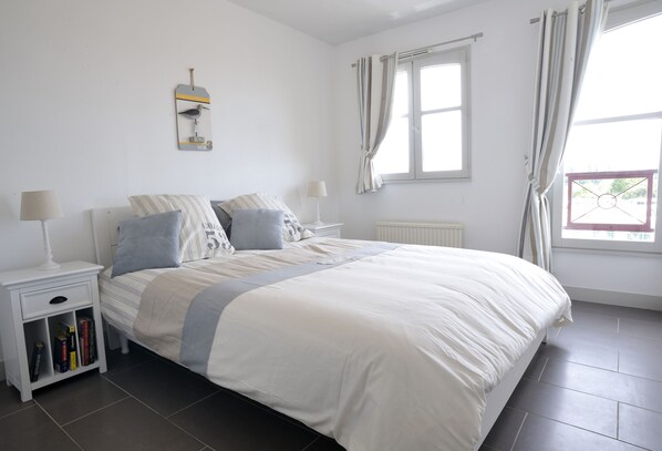 Einem Schlafzimmer mit neuer Bettwäsche und geschmackvoller Einrichtung, mit einem großen Bett von 1,60 m x 2 m (neue Bettwäsche)