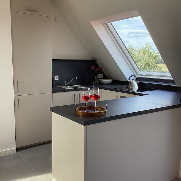 Diese schöne OG-Ferienwohnung mit Balkon befindet sich in einem renovierten Fachwerkhaushaus. Sie verfügt über ein separates Schlafzimmer mit einem Doppelbett und ein modernes Bad mit Dusche und Badewanne. Das moderne Wohn-Esszimmer ist mit einer hochwertigen Küchenzeile und einer gemütlichen Sitzecke eingerichtet. In der Küchenzeile ist eine Spülmaschine, Backofen, Mikrowelle und Cerankochfeld, Kühlschrank mit Gefrierfach vorhanden. Zur gehobenen Ausstattung gehört ein Flachbildfernseher und kostenfreies WLAN.
