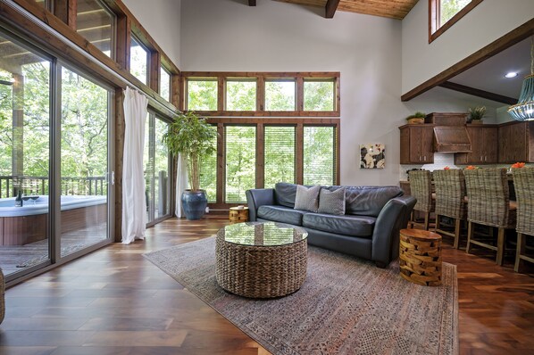 Diese abgelegene Umgebung ist der ideale Ort, um morgens ein Frühstück oder Kaffee zu genießen oder einfach im großzügigen Whirlpool zu entspannen. Schätzen Sie die 20 'gewölbten Bambusdecken mit großen Fenstern, die viel natürliches Licht in den Hauptwohnbereich bringen. 4K-60 "-Samsung-Fernseher mit Bluetooth-Soundbar, Apple TV und eine Retro-Videospielkonsole machen diese Kabine zum perfekten Ort für Unterhaltung. Erstellen Sie lange Erinnerungen und den Wunsch, diese Kabine zu Ihrem regulären Zuhause zu machen, wenn Sie nach Broken Bow zurückkehren!