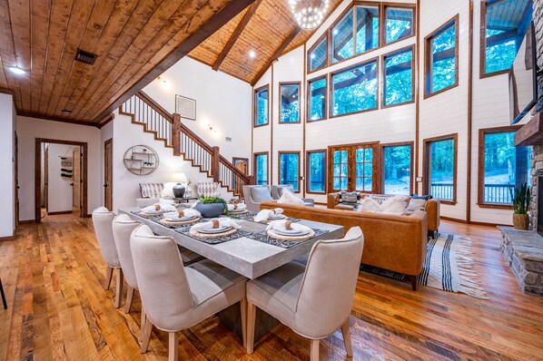 Inside, vaulted ceilings and a see-through fireplace connect the open floor plan of the living, dining, and kitchen areas, creating a warm and welcoming environment. The dining area comfortably seats eight guests. For entertainment, the upstairs game room features a pool table, vintage Atari gaming console, and a large TV area.
