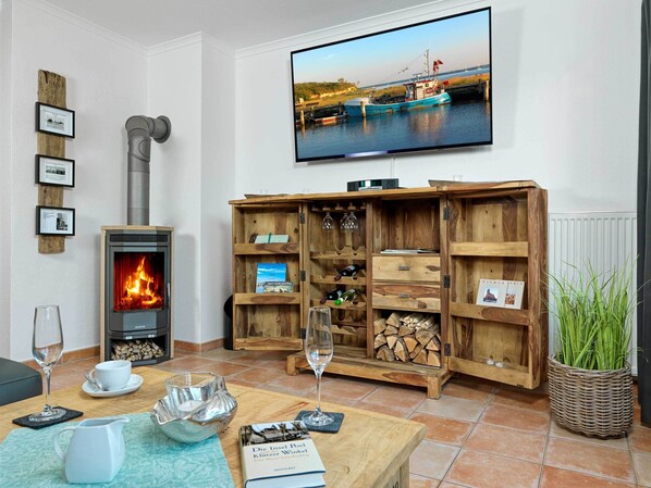 Diese Doppel-Haushälfte verfügt im Erdgeschoss über einen großzügigen, hellen Wohnraum mit separater Essecke, Kaminofen und moderner Einbauküche. Vom hochwertig und liebevoll eingerichteten Wohnzimmer aus haben Sie direkten Zugang zur Terrasse mit Gartenmöbeln für gemütliche Sonnentage.