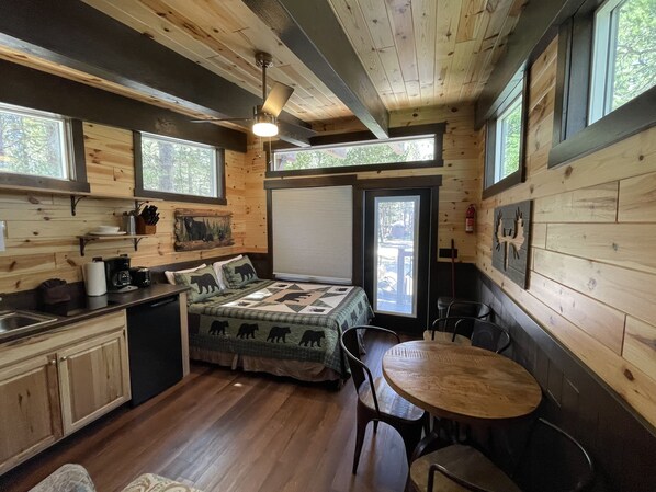 We enjoyed our 4-night stay at this cabin. It was just me and my wife and we had enough space. It was clean and had everything we needed. There is no dressers or anything you can put your clothes away. We ended up with our suite cases on the bunk beds. It sleeps 4 and with 2 kids in the bunk bed it would be OK but just not a lot of room for clothes. Only recommendation we have is to make sure the fitted sheets is of proper size and pocket depth for the queen bed. Ours wasn't and kept on coming off every time we laid in it and ended up sleeping on the mattress itself with the sheet all wadded up inside the bad. Kinda annoying...lol It's a Purple brand Matterses and was comfortable,