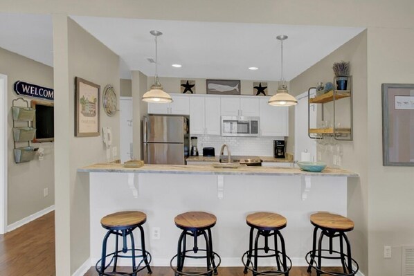 Gehen Sie in den zweiten Stock des Komplexes an der Küste und betreten Sie Ihre Unterkünfte. Der offene Grundriss ermöglicht viel Licht und einen einfachen Zugang zu allen Räumen. Die gemütliche Küche ist mit Barhockern ausgestattet und befindet sich direkt neben dem großen Esstisch. Das gut ausgestattete Wohnzimmer bietet viele Sitzgelegenheiten und einen Blick auf den privaten Poolbereich der Wohnanlage.