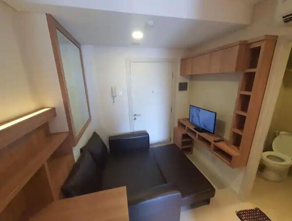 This room has 1 Bedroom, 1 Bathroom and also a balcony. This room has 2 AC units located in the Bedroom and in the Living Room. . In the Living Room, we provide sofabed so can sleep extra 2 people. This apartment also provides TV with international and local channels, refrigerators, microwaves, stoves, water heaters and tableware. This apartment is equipped with 24-hour security connected to Intercon inside the unit.