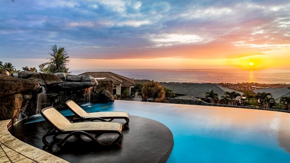 Im Freien können Sie den ganzen Tag im Infinity-Pool schwimmen oder auf der Sonnenterrasse im Pool entspannen. Verbringen Sie einen ruhigen Moment, um die Koi in unserem 3.000-Gallonen-Teich zu beobachten. Entspannen Sie sich in der großen Hängematte und genießen Sie den herrlichen Sonnenuntergang. Sie können sogar die Aktivitäten des Tages in der erfrischenden Außendusche abwaschen.