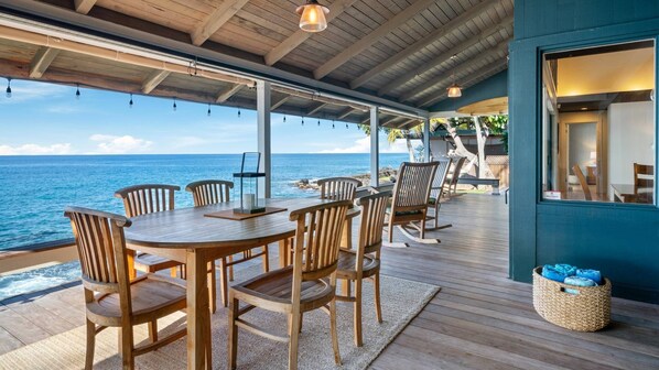 Die Küche ist gut ausgestattet und verfügt über Küchengeräte aus Edelstahl. Sie können Mahlzeiten zubereiten, während Sie auf das Meer schauen und die Surfer beobachten. Der Esstisch bietet Platz für bis zu 4 Personen oder Sie können Ihr Abendessen auf der privaten Veranda genießen (zusätzlicher Esstisch mit 6 Sitzplätzen ist vorhanden)! Der Wohnbereich ist in einem entspannten Inseldekor eingerichtet und sowohl der Wohnbereich als auch der Essbereich öffnen sich zur Veranda mit Blick auf den Ozean. Dies schafft eine sehr weitläufige und private Atmosphäre für Ihren Strandurlaub. Entspannen Sie sich auf der Veranda mit einem Buch und Ihrem Morgenkaffee, um Ihren Tag wunderbar zu beginnen. Während die Meereswellen brechen, erinnern sie Sie daran, dass Sie sich tatsächlich an einem ganz besonderen Ort befinden.