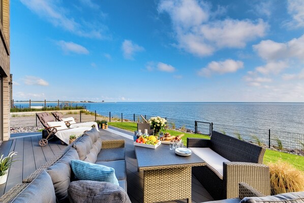 Zwei große Terrassen und eine schöne Rasenfläche bieten viel Platz zum Entspannen und Wohlfühlen. Die hochwertige Ausstattung verspricht höchsten Wohnkomfort für Groß und Klein. Von der großen Sonnenterrasse haben Sie einen traumhaften Blick über die freie Ostsee bis nach Dänemark und auf die Schleimündung mit dem Leuchtturm Schleimünde.