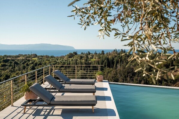 Large glass patio doors lead out from the living area onto a beautiful terrace equipped with several sitting and lounge furniture offering unique relaxation and isolation. From there you have also access to the amazing private pool with stunning views of the Ionia Sea and Zakynthos with several relaxing sunbeds.