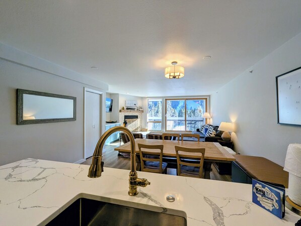 The fully renovated kitchen (2023) features sleek stainless steel appliances, modern cabinetry, and updated countertops. It's fully stocked for home-cooked meals, and the adjacent dining area offers ample space for family dinners or an après-ski game night.