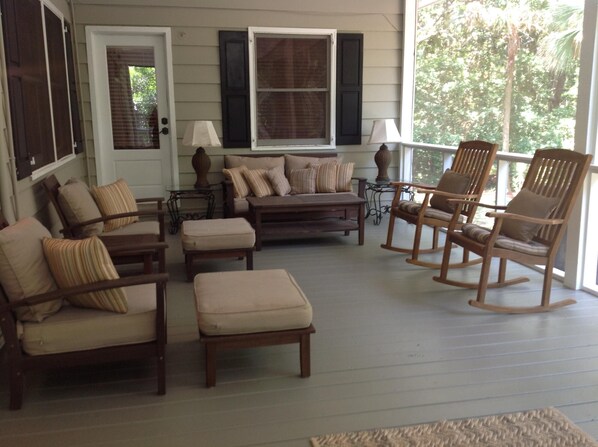 Dies ist ein großes Waldgrundstück, das sichert zu anderen stark bewaldeten viel, mit verschiedenen Wildtieren (Hirsche, Waschbären, etc.) in den Hinterhof. Das gemütlich eingerichtete Haus verfügt über ein Kingsize-Schlafzimmer, zwei Queen-Schlafzimmer, und zwei Schlafzimmer mit zwei Einzelbetten. Die King- und Queen-Schlafzimmer befinden sich auf der Vorderseite mit eingeschränktem Meerblick (derzeit ist ein Haus abgerissen und es gibt einen erweiterten Meerblick). Alle Betten verfügen über neue, luxuriöse Matratzen. Ein Wohnzimmer mit einem Kamin und einem 55-Zoll-Flachbild-TV öffnet sich zu einer abgeschirmten Veranda vor dem Wohnzimmer und dem Esszimmer mit einem Charleston Forge-Esstisch, Stühlen und Eckregalen. Angrenzend an den Speisesaal befindet sich ein verglaster Wintergarten mit einem 48-Zoll-Flachbildfernseher, einem Essbereich (einem Glastisch mit vier Stühlen) und Sitzmöglichkeiten mit Blick auf das Meer. Dieses Zimmer öffnet sich zu einer geräumigen, abgeschirmten Veranda mit einem bequemen Sitzbereich an einem Ende und einer Essgruppe für sechs Personen am anderen Ende und 2 Deckenventilatoren für Komfort sowie einem Edelstahl-Gourmet-Grill auf einem Betonbereich vor der Veranda eine Außendusche.