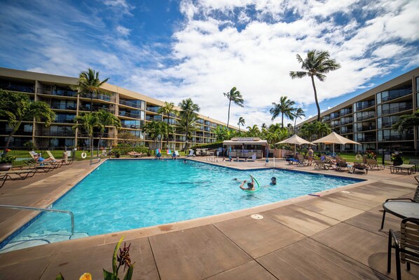Maui Sunset is a fabulous oceanfront property in Kihei that has lush tropical landscaping, large pool which is heated during the winter months, hot tub, gas grills, workout room, and tennis courts out on the beach for your use. Guests return here year after year which says a lot about this property. Windsurf, whale watch, walk the beach and enjoy magnificent sunsets.