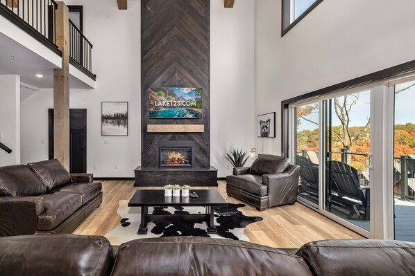 This modern, three-level lake house features 3 spacious bedrooms and a full walkout basement, perfect for families or groups. The open living area flows seamlessly into a gourmet kitchen with stainless steel appliances and a large island for gathering and meal prep. Enjoy plenty of seating with a dining table for 6-8, an island bar, and two screened-in deck tables overlooking the lake. The home boasts multiple king en-suite bedrooms, a game room with shuffleboard, and a private hot tub on the covered patio. With stylish furnishings and thoughtful amenities throughout, this is the ideal spot to relax and make lasting memories.