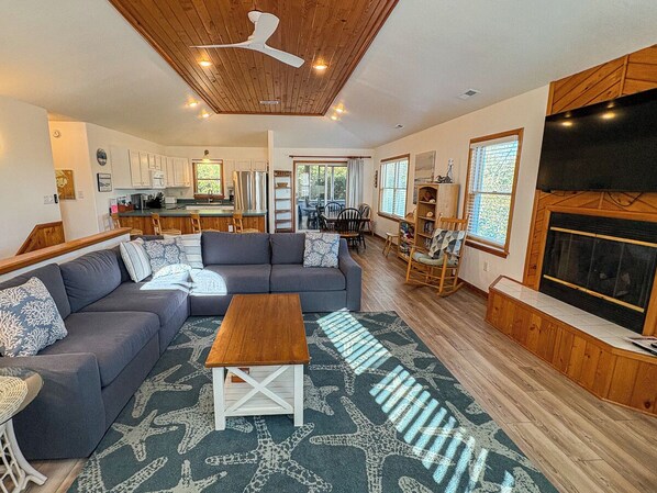 3 bedrooms (1 with Queen with Roku TV, Blu-ray player, private bath with shower; 1 with Queen, Roku TV, Blu-ray player; 1 with 2 Bunk sets, TV, Blu-ray player; shared full bath with tub and shower); laundry room.