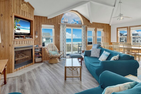 Enjoy spectacular views from the Top Level Living Area with a large Flat-Screen TV and access to the Furnished Deck. Relax on the cozy nautical furniture and let the bright, airy atmosphere of the high ceilings brighten your mood and spark the start of a fun, relaxing vacation. Make something delicious in the nearby Kitchen for the whole family to enjoy. With seating for 10 in the Dining Area and 4 at the Kitchen Counter Bar, there's plenty of room for everyone to spread out and enjoy a delectable feast. Take your morning coffee out onto the Furnished Sun Deck for an unforgettable Outer Banks sunrise or relax in the evening as you watch the stars sparkle in the night sky. Pass by the Hallway Half Bathroom on your way to the Queen Master Bedroom where you can relax with a TV, Whirlpool Tub in the Private Bathroom, and easy Deck Access.