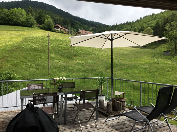 In dem modern angelegten Bad gibt es einen großen Whirlpool mit Sternenblick durch das darüber liegende Dachfenster und im offenen Wohnraum vermittelt der moderne Kaminofen das herrliche Gefühl von Wohlfühl-Atmosphäre innerhalb von warmen Farben und kleineren persönlichen Stilelementen. Durch die große, offene Küchenecke tritt man auf die herrliche Sonnenterrasse mit erhabenem Blick auf den Belchen, dem zweithöchsten Berg des Schwarzwaldes.