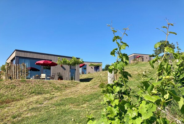 Fotogalerie von MoselHoch 2 ist das mittlere von drei Ferienhäuschen am Rande der Weinberge.