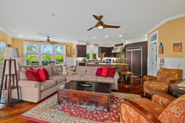 Hale Keleka, eine Unterkunft mit 4 Schlafzimmern und 4 Bädern in Poipu / Koloa, verfügt über ein hawaiianisches Plantagen-Flair, das ein Haupthaus mit 3 Schlafzimmern und ein separates Ohana (Gästehaus) mit 1 Schlafzimmer umfasst. Bringen Sie Ihre 12-er Gruppe mit und genießen Sie einen geräumigen Grundriss mit offenem Konzept, einen Innen- / Außenbereich und Ihren eigenen privaten Whirlpool auf der geschlossenen Terrasse.