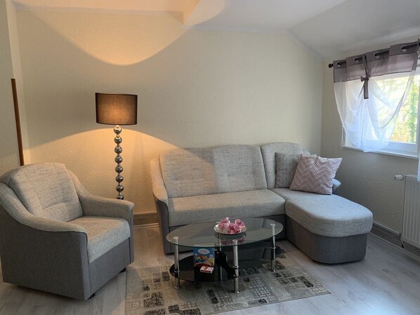 Über den separaten Eingang führt eine Treppe zur geräumigen 3-Zimmer Ferienwohnung. Die Ferienwohnung verfügt über ein Wohnzimmer mit Schlafcouch und einen Essbereich, 2 Schlafzimmer, eine eingerichtete Küche sowie ein Bad mit Dusche und WC.