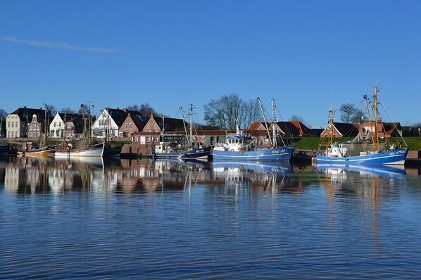 Die Ferienwohnung liegt im malerischen Fischerort Greetsiel, einem der beliebtesten Urlaubsziele an der ostfriesischen Nordseeküste. Zentral und dennoch ruhig gelegen, sind der historische Hafen mit seinen Krabbenkuttern, die berühmten Zwillingsmühlen sowie charmante Cafés, Restaurants und kleine Geschäfte bequem zu Fuß erreichbar. Die umliegende Deichlandschaft lädt zu Spaziergängen, Fahrradtouren und Erkundungen der Weite Ostfrieslands ein. Mit der Nähe zum Wattenmeer und den ostfriesischen Inseln ist die Ferienwohnung ein perfekter Ausgangspunkt für maritime Erlebnisse und entspannte Urlaubstage.