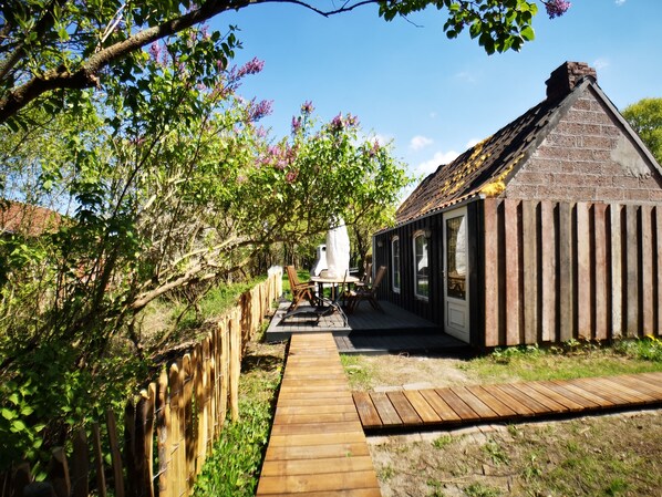 Vor dem Gartenhaus ist unsere Terrasse die ausgestattet ist mit einem echten Nordsee Strandkorb und einer Tischgruppe aus Teakholz. Einen Grill haben wir auch für Sie.