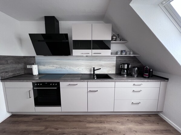 Die Küche ist u.a. mit Kühlschrank inkl. Gefrierfach, Backofen, Ceran-Kochfeld, Geschirrspülmaschine, Kaffeemaschine, Nespresso-Kapselmaschine, Wasserkocher und Toaster ausgestattet. Direkt angrenzend steht ein großer Esstisch mit vier Stühlen.