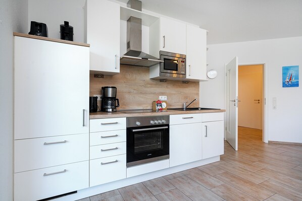 Der geräumige Wohn-/Essbereich mit integrierter Küche ist mit einem komfortablen Esstisch, zwei gemütlichen Sofas sowie einem großen Flachbild-TV, Radio mit USB-Anschluss und WLAN ausgestattet. Eine Spielesammlung lädt ein zum geselligen Beisammensein.