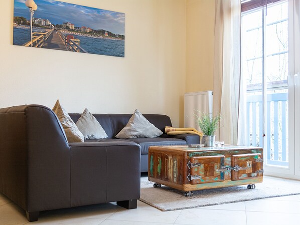Sie wohnen in einer sehr geschmackvoll eingerichteten 3-Raum-Wohnung von ca. 68 qm Größe, die im ersten Obergeschoss liegt. Das Wohnzimmer ist ausgestattet mit Küchenzeile (Herd mit Backofen, Geschirrspüler, Kaffeemaschine, Wasserkocher, Toaster, Mikrowelle), bequemer Sitzgruppe, Essecke, Stereoanlage und TV-Gerät. Vom Wohnraum aus betreten Sie den Balkon in Richtung Westen, der zum Entspannen einlädt. Ein Schlafzimmer mit Doppelbett und ein Schlafzimmer mit Etagenbett sowie das Bad mit Dusche und WC vervollständigen das Gesamtbild dieser Wohnung.