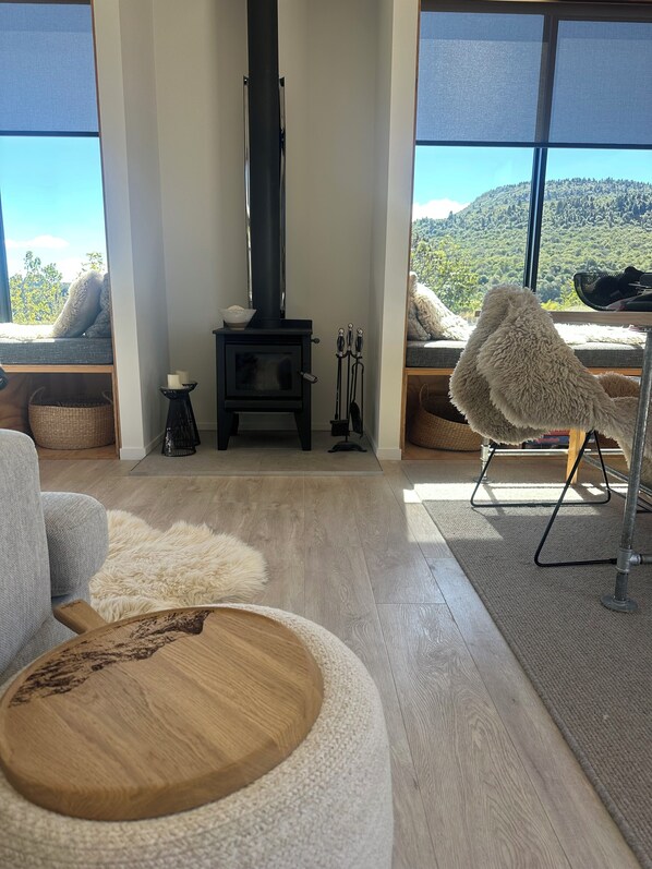 The inviting living area features a comfortable couch, warming fireplace for cozy winter evenings and days, thoughtful window seats perfect for reading, dining table along with an assortment of authentic New Zealand sheepskins for ultimate comfort. The full kitchen comes equipped with a dishwasher and all necessary kitchenware, including essential wine glasses.