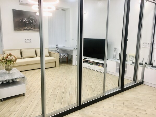 Wonderful new apartment with elegant style located in the heart of the Kiev center in a safe and quiet place. There is a fast wifi. The 2 rooms and the kitchen have doors separating them, avoiding any odors after cooking in kitchen. The lights in the apartment are very bright, and there is a possibility to use smaller lights for a more relaxing ambiance.