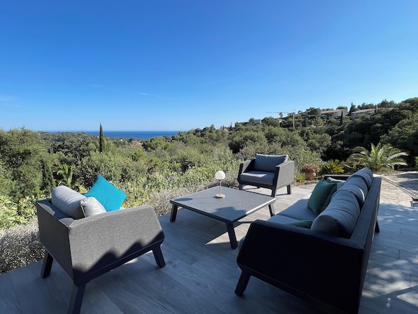 De la terrasse on peut profiter d'une vue dégagée sur la mer et sur le vallon végétal de la Croix Valmer.