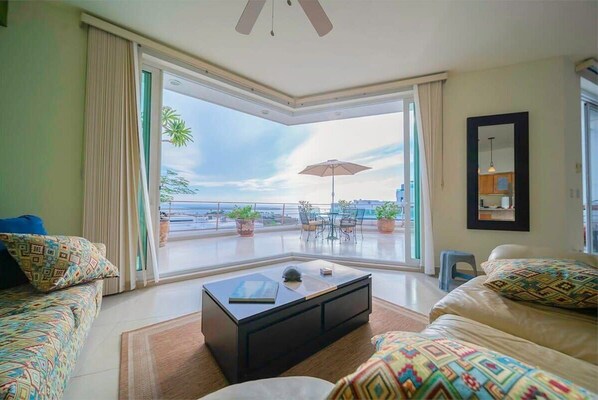 - The open floor plan of the main living area allows everyone to mingle and has direct access to the terrace through floor-to-ceiling sliding glass doors that, when opened, extend the space from indoors to outdoors.