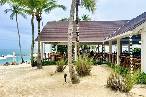Das Wohnzimmer verfügt über eine gemütliche Sitzecke mit Sofas und Stühlen - ein großartiger Ort, um sich zu entspannen und mit Freunden und Familie zu unterhalten. Der Esstisch bietet bequem Platz für 10 Personen und ist ein großartiger Ort, um Ihre "formellen" Abendessen zu genießen. Das Ess- und Wohnzimmer öffnet sich zu einer Marmorterrasse, die einen privaten Bereich zum Frühstück umfasst, und mündet in eine sehr große Terrasse mit Liegestühlen und Stühlen, die einen schönen Pool und einen Whirlpool umgibt, die alle von einem tropischen Blumen- und Palmengarten umgeben sind. An einer Seite des Pools befindet sich ein hübscher Pavillon, in dem das Mittag- oder Abendessen serviert werden kann. Eine Dusche ist ebenfalls vorhanden. Neben dem Pool befindet sich ein kleiner Pavillon mit einem Strohdach aus Zuckerrohr für heiße Nachmittage oder romantische Abende.