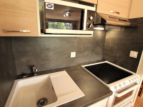 Dieses charmante Studio-Apartment verfügt über eine Schlafnische mit Etagenbetten, einen Wohnbereich mit ausziehbarem Schlafsofa (für 2 Personen) und Fernseher sowie eine Küchenzeile mit Dreiflammen-Elektroherd, Backofen und Geschirrspüler. Dusche und WC sind separat.