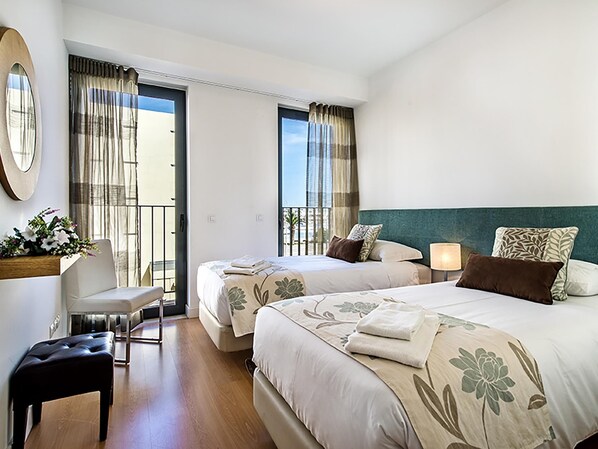 Wenn man die Wohnung betritt, kommt man in einen geräumigen Flur mit einem Spiegel und einem Konsolentisch mit modernen Strahlern an der Decke. Auf der linken Seite befinden sich die beiden Doppelschlafzimmer und vor ihnen das Badezimmer. Beide Schlafzimmer sind mit Klimaanlage und Einbauschränken ausgestattet und bieten teilweise Blick auf den Yachthafen und die Hauptstraße von Lagos. Das Badezimmer ist modern und mit einer Badewanne und einer Dusche über der Badewanne ausgestattet.