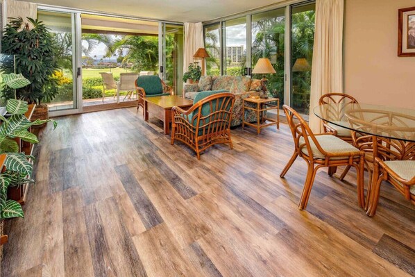 The photos of the condo don’t do it justice. It is super spacious and the view is amazing. It is very peaceful sitting out on the lanai overlooking the golf course and the ocean. The walk (or golf cart ride) down to the ocean is easy and the beach cabana is very nice. It is great that they have beach chairs and clean towels there as well as shade. The property owner could not have been any more accommodating. He arranged for early check in and was easy to communicate with when I had questions. We had a leak one day and he arranged for maintenance immediately.