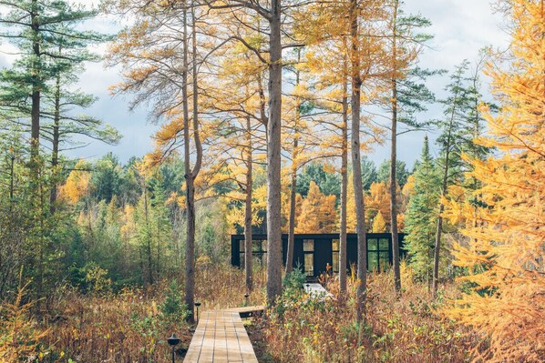 Sunrise Lane is the OG - the first home built by Hygge Supply. The home sits on a tranquil stretch of preserved wetland that leads to lakeside access to stunning Lake Leelanau. The floor-to-ceiling windows allow you to feel one with the outdoor surroundings. Views of tall tamarack trees, cattails, and wetland flowers greet you the minute you walk in the front door. The local wildlife thrives on this protected piece of property, so expect to see deer, rabbits, squirrels, birds, and, if you're lucky, an occasional bobcat sighting.