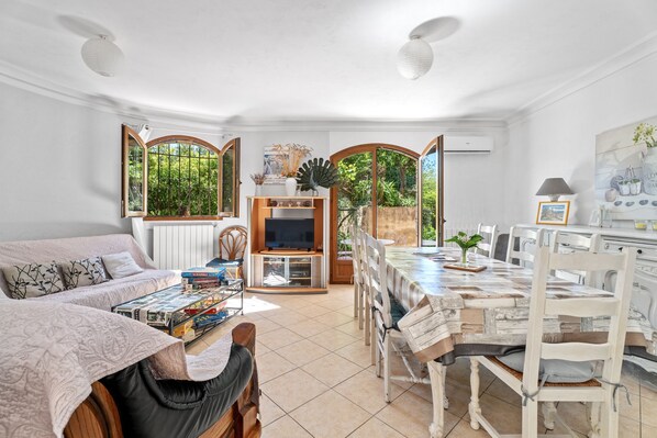 - A 15 m² living room with TV, double sofa bed...