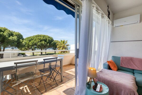 Genießen Sie einen entspannten Aufenthalt mit Meerblick vom Balkon, Klimaanlage für optimalen Komfort, direktem Zugang zum Strand und vier festen Schlafplätzen.