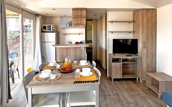 Enjoy a memorable stay at our 42 m² mobil-home which boasts: