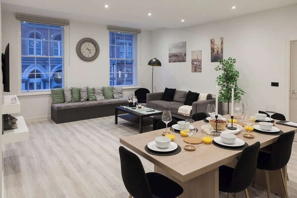 This stylish apartment offers a comfortable and convenient stay in the heart of Leeds. With a spacious living area, fully equipped kitchen and offering 4 double beds in 2 bedrooms and 2 bathrooms. Located just steps from shops, restaurants, and attractions, and only only a 5 min walk from the train station, main shopping area and 15-20 min drive to Leeds/Bradford airport.