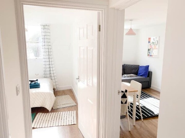 we have RENOVATED the Entire Appt. everything you see in the flat is brand new. decorated tastefully by a designer (my partner) :) This Flat is very cosy and make you feel very homely. you will love the brand new memory foam mattress and nice decor throughout. this room has a beautiful Sash windows and plenty of light. great main street view from your windows which looks spectacular. good wifi ,desk and a chair to do your work in both rooms.