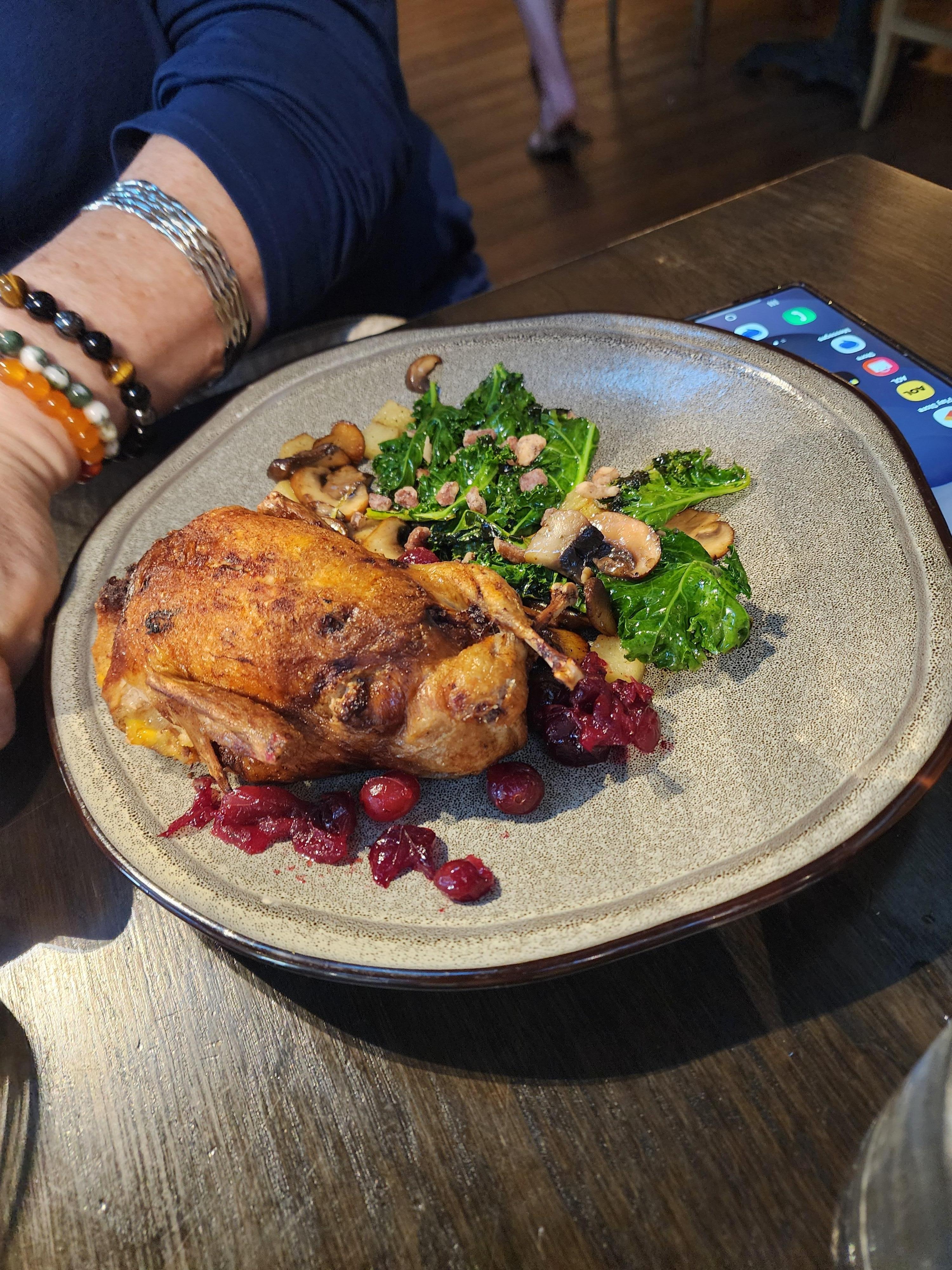 Room was clean but bathroom could use a counter food was great salmon was perfectly cook the quail was cook well we enjoyed the music while we ate over all was very happy with our stay