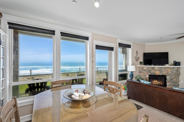 A fully equipped kitchen with stainless steel appliances allows vacationers to prepare their own cuisine which can be enjoyed at the oceanfront dining room table. When your meal is complete, unwind on the couch or recliner next to the river rock gas fireplace and enjoy a movie on the Smart television.