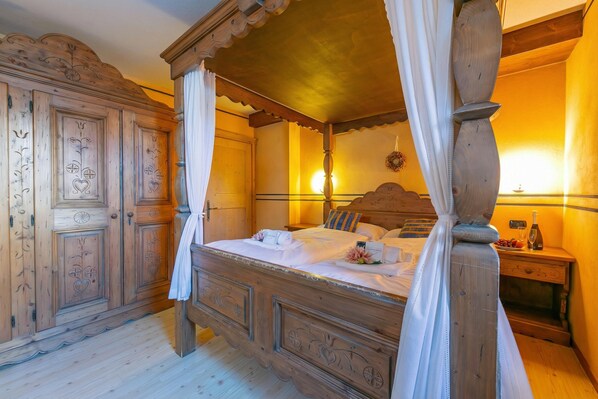 Genießen Sie den Luxus dreier großer Schlafzimmer. Eines bietet ein romantisches Himmelbett aus Massivholz und einen Schminkbereich, die beiden anderen Räume enthalten Doppelbetten, TVs und Schreibtische. Das bezaubernde Innendekor besteht aus geschmackvollen warmen Tönen und Möbelstücken.