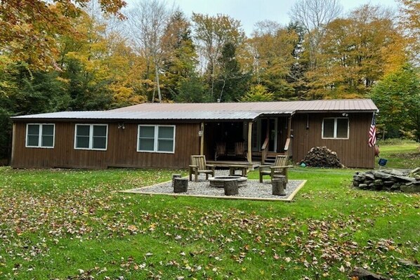 Outdoor Experience: • Private fire pit for cozy nights under the stars • Charming covered front porch for slow mornings and evening unwinding • Covered deck overlooking the creek — perfect for relaxing to the sounds of flowing water • Cattail Creek runs through the property, creating a peaceful, nature-filled setting • Serene Catskills surroundings with trees, fresh air, and total relaxation