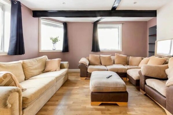 NETFLIX and Disney plus and a catalogue of shows and entertainment can be watched in HD. The 50 inch wide screen TV looks over the 2 lay-back sofas.