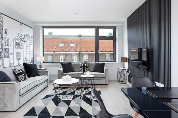 - Living area with 2 sofa beds for additional guests, armchair, coffee tables, and Smart TV.