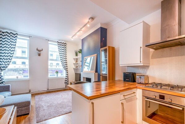 ✨ Bright & Spacious Living Area – Large windows overlooking Balham High Road, fast WiFi, a fully equipped kitchen, breakfast bar & a cozy sofa for movie nights.
